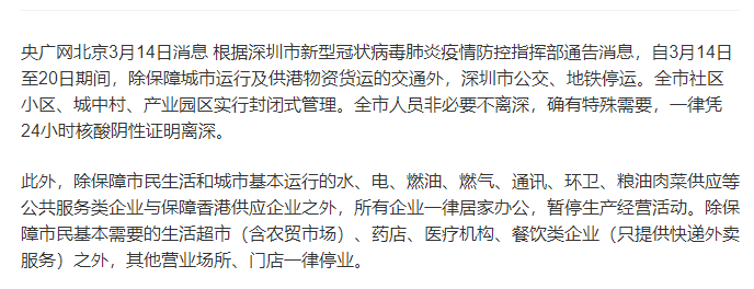 自3月14日深圳市政府宣布為了疫情防控,除保障城市運行及供港物資貨運的交通外,全市公交、地鐵停運。全市社區小區、城中村、產業園區實行封閉式管理。全市人員非必要不離深,確有特殊需要,一律憑24小時核酸陰性證明離深。
